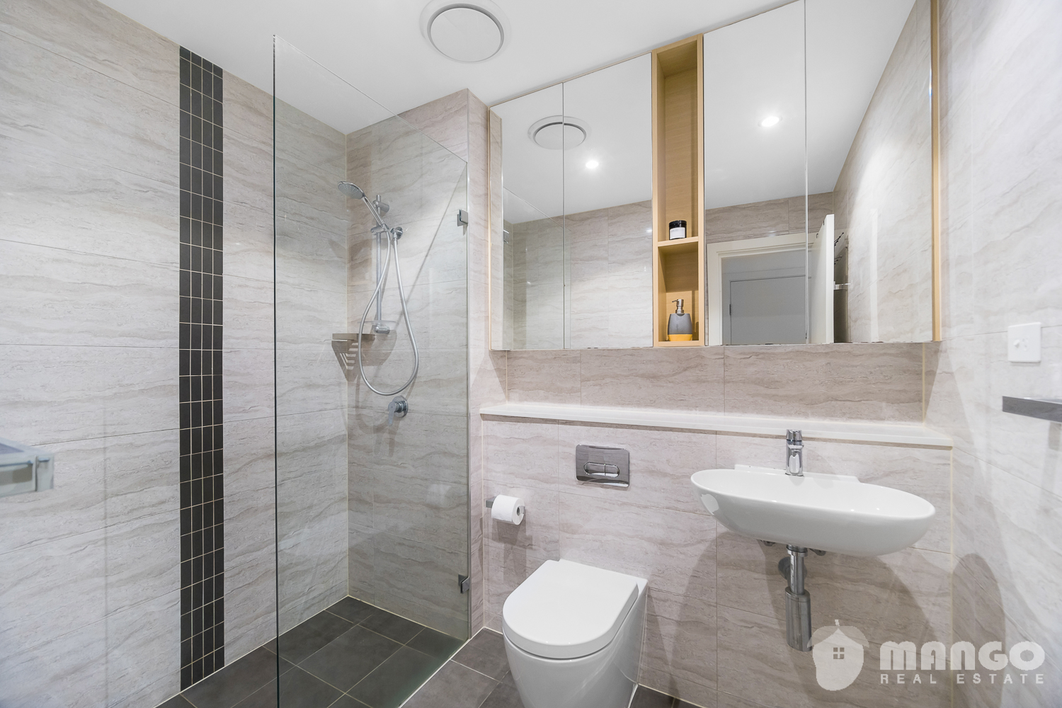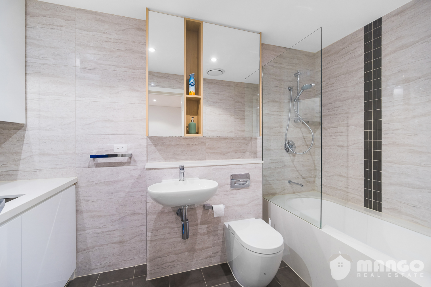 - Sleek designer bathrooms both with mirrored cabinets, wall hung basin, floor to ceiling tiles and a bath tub