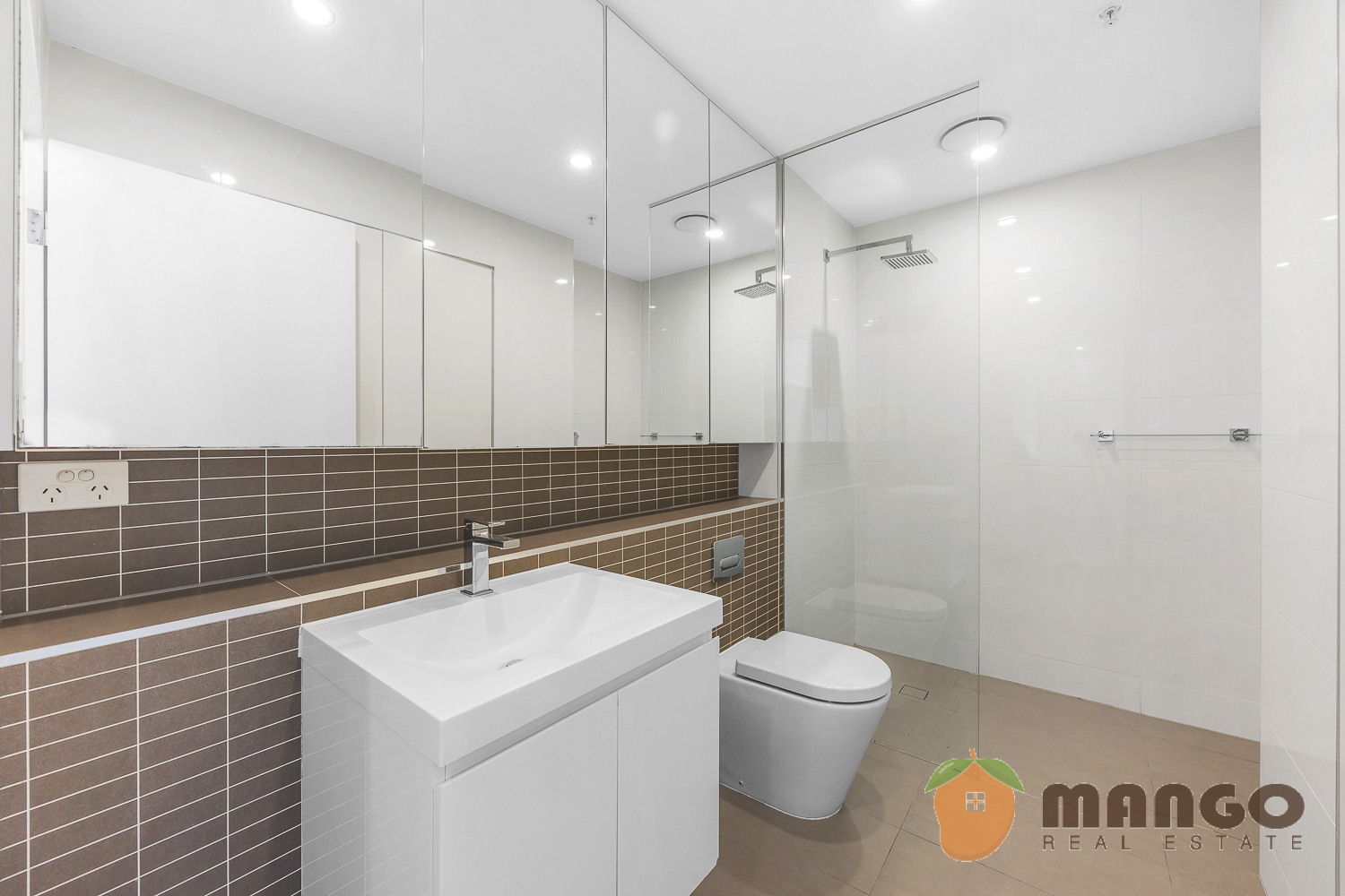 - designer two bathrooms both with mirrored cabinets and floor to ceiling stylish tiles