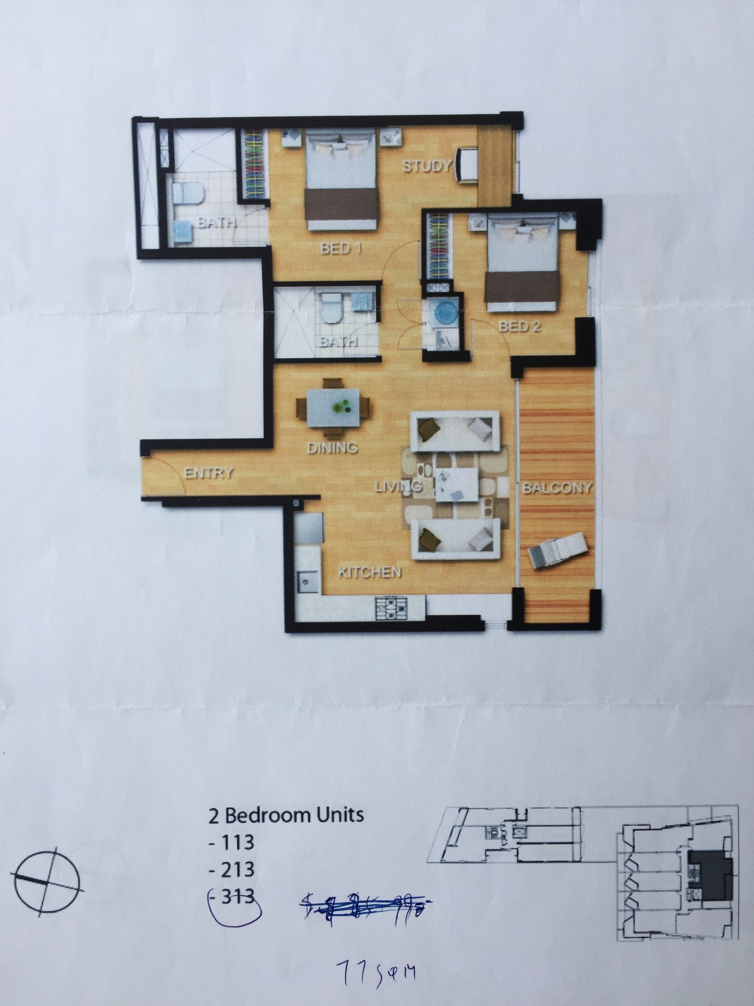 - Total area: 94sqm (77sqm including balcony + 14sqm car space + 3sqm sotrage)