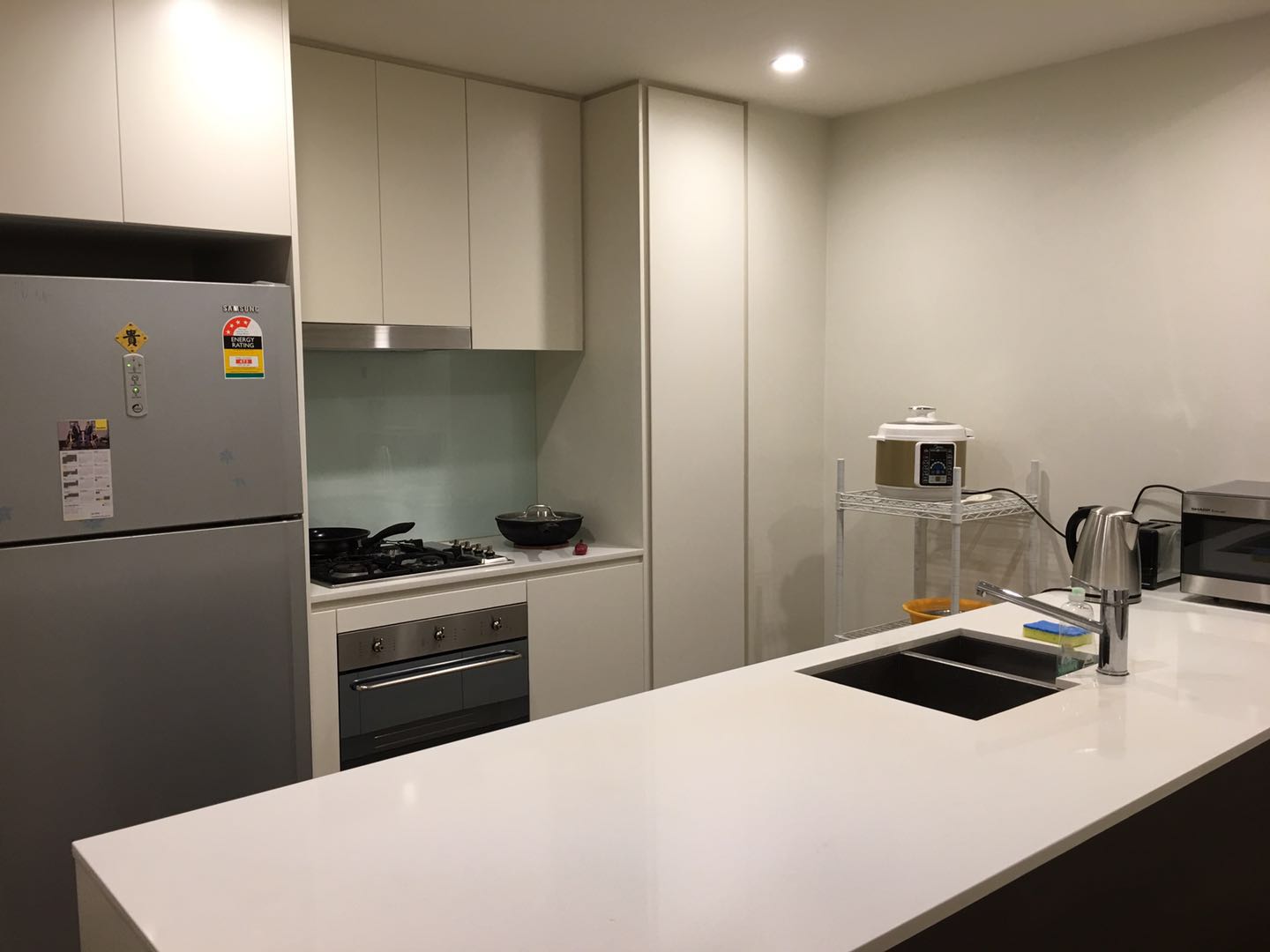- Modern kitchen with Caesar stone bench top, gas cooktop and stainless steel appliances