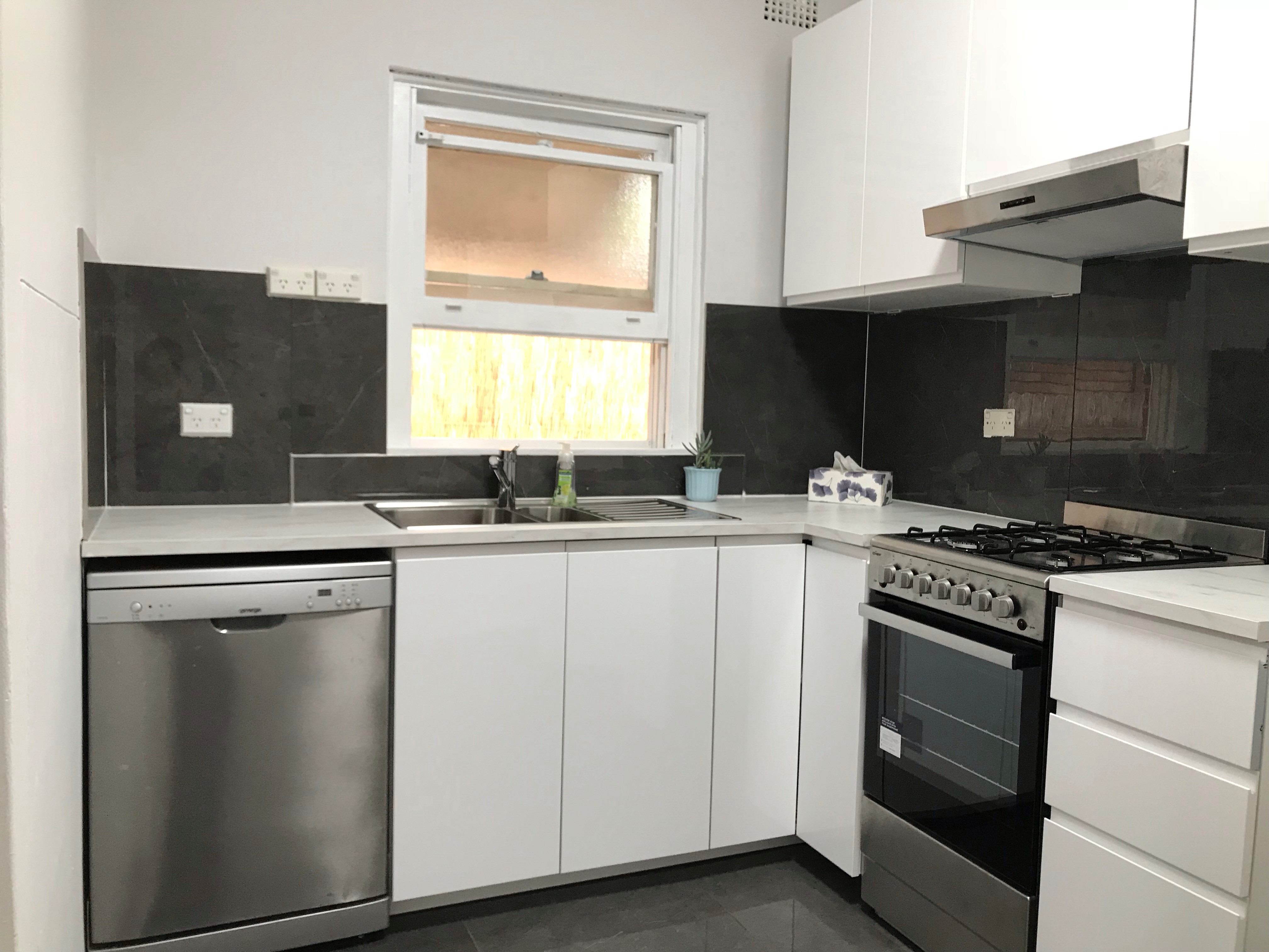 - newly renovated kitchen equipped with gas cook tops, dishwasher, rangehood and oven
