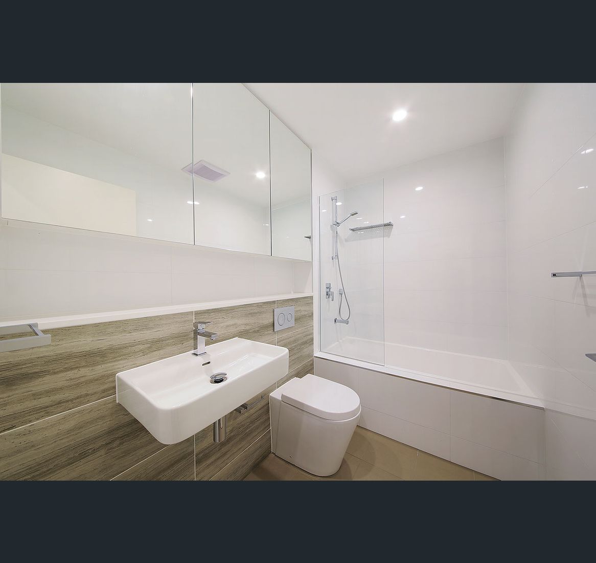 - designer bathrooms with mirrored cabinets, wall hung basin and floor to ceiling tiles, one bathroom with a bath tub
